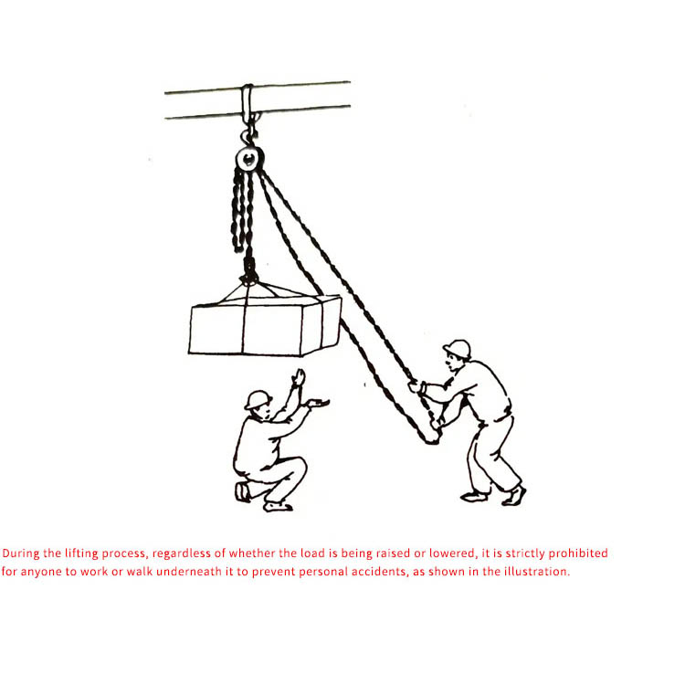 Forbyd strengt overbelastning: Løftevægten må aldrig overstige den nominelle belastning (angivet på typeskiltet). Brug ikke anden strømkilde end manuel kraft til at trække kæden.